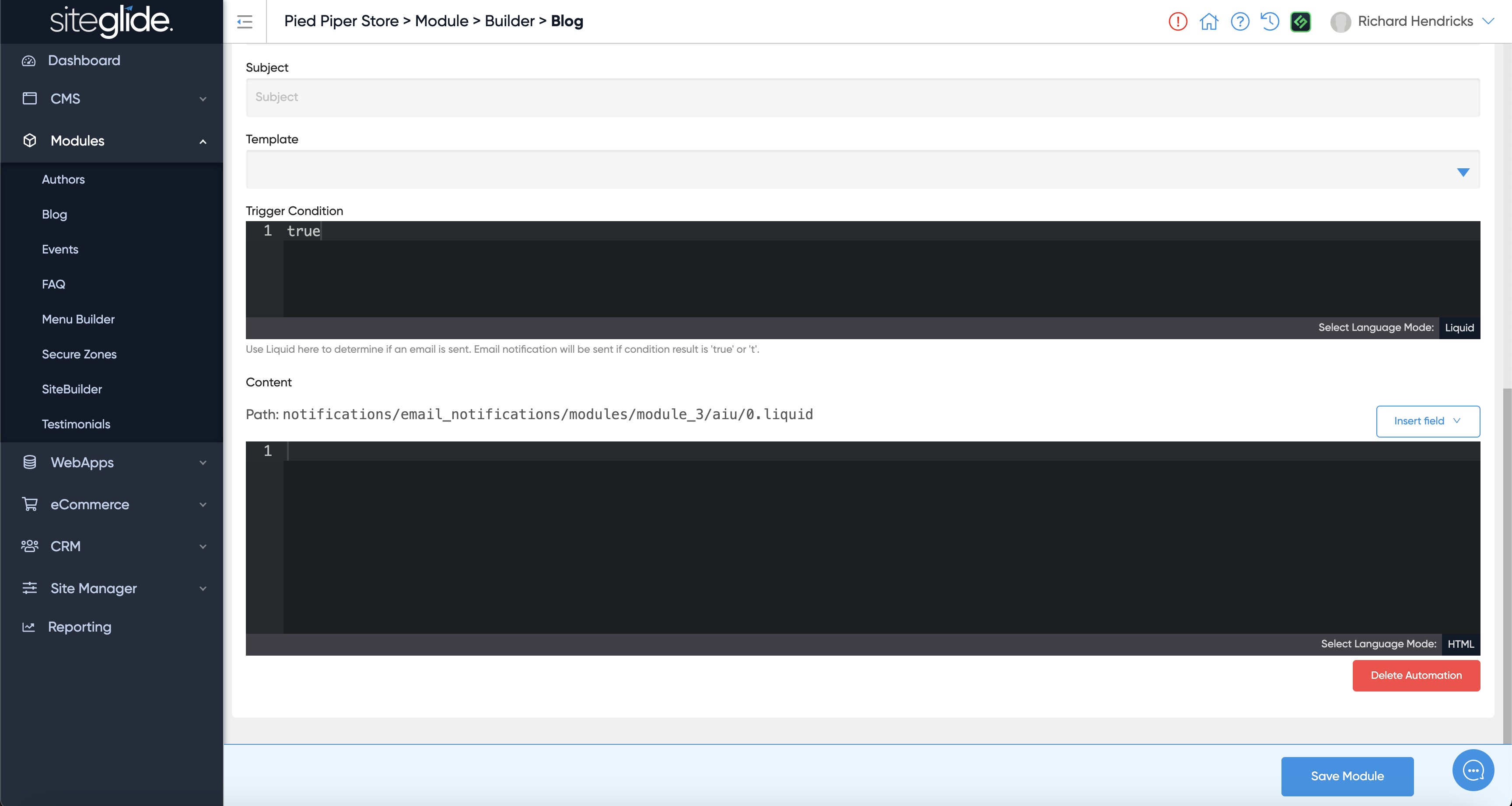 Automations can be added in various places in Siteglide including: