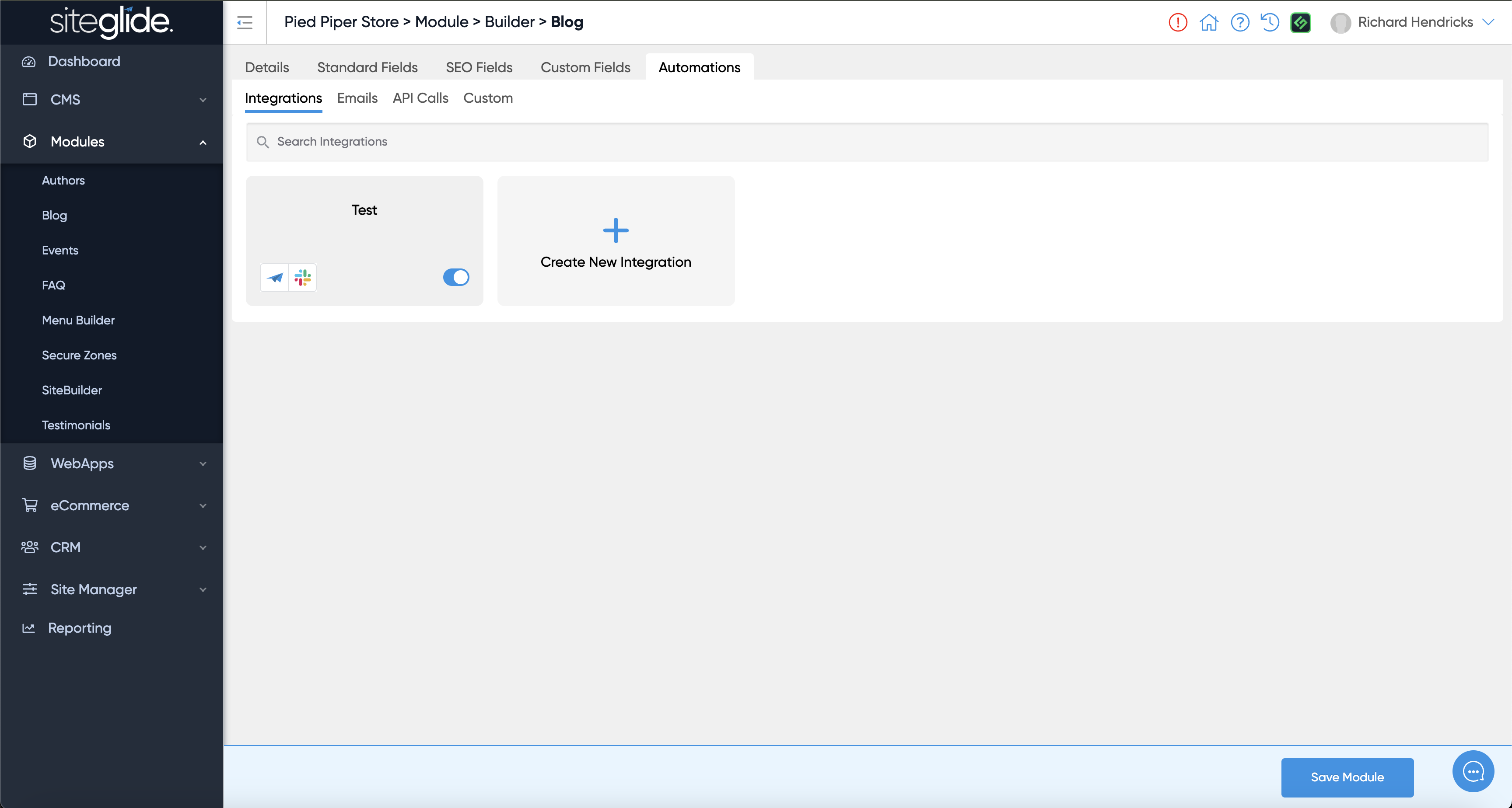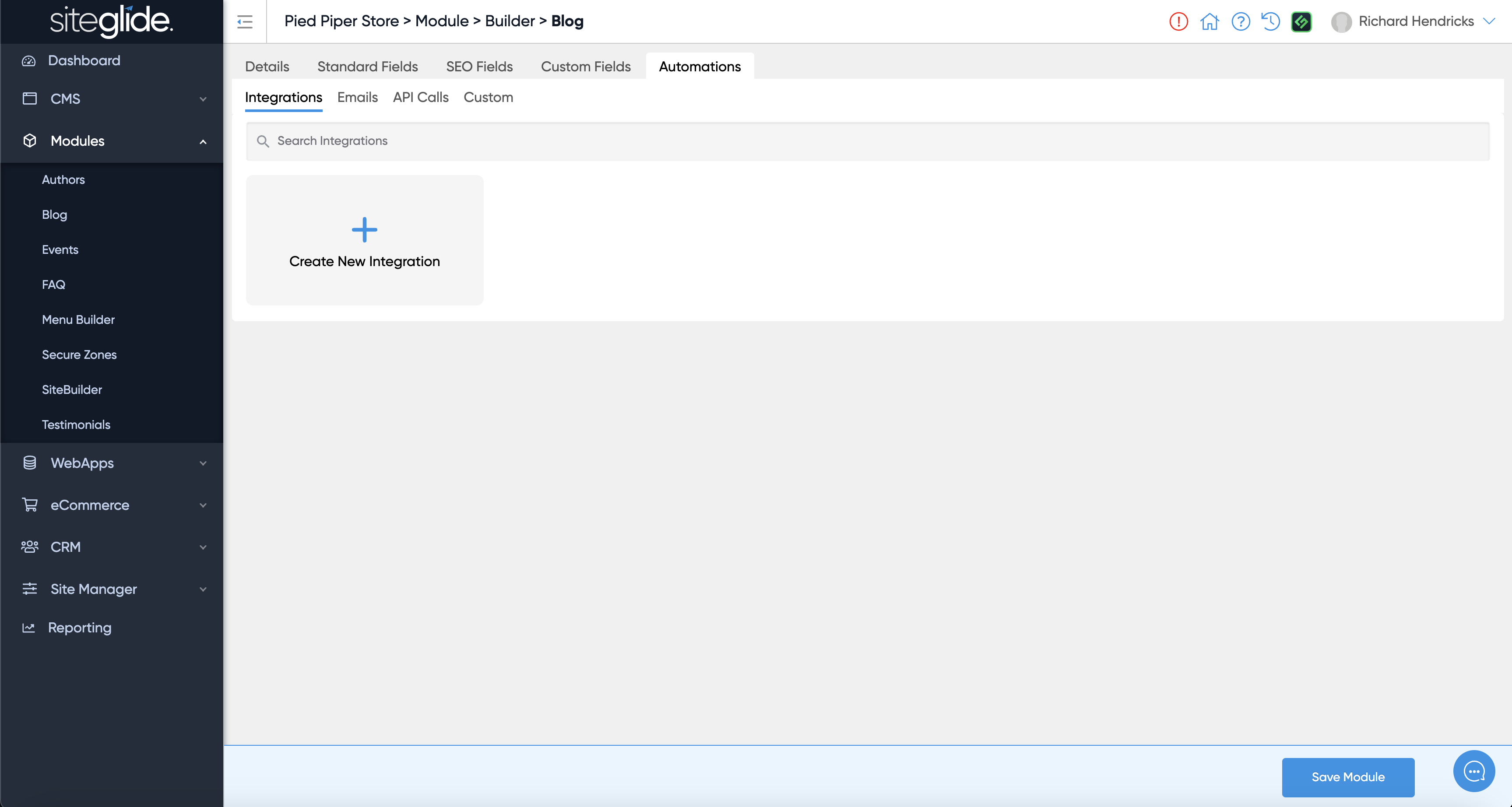 Click the 'Create New Integration' button and then choose a Siteglide Trigger and ensure you give it a name: