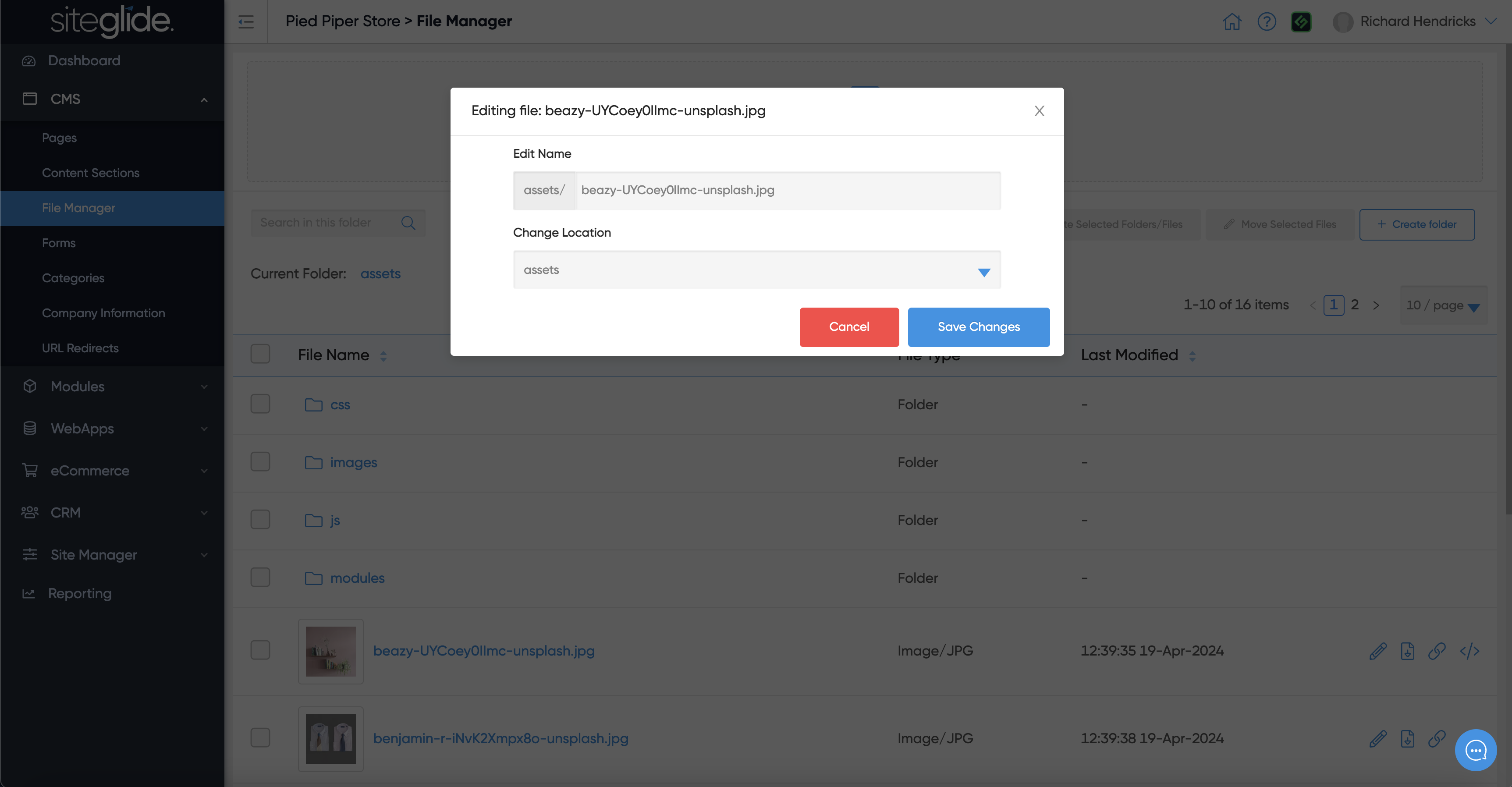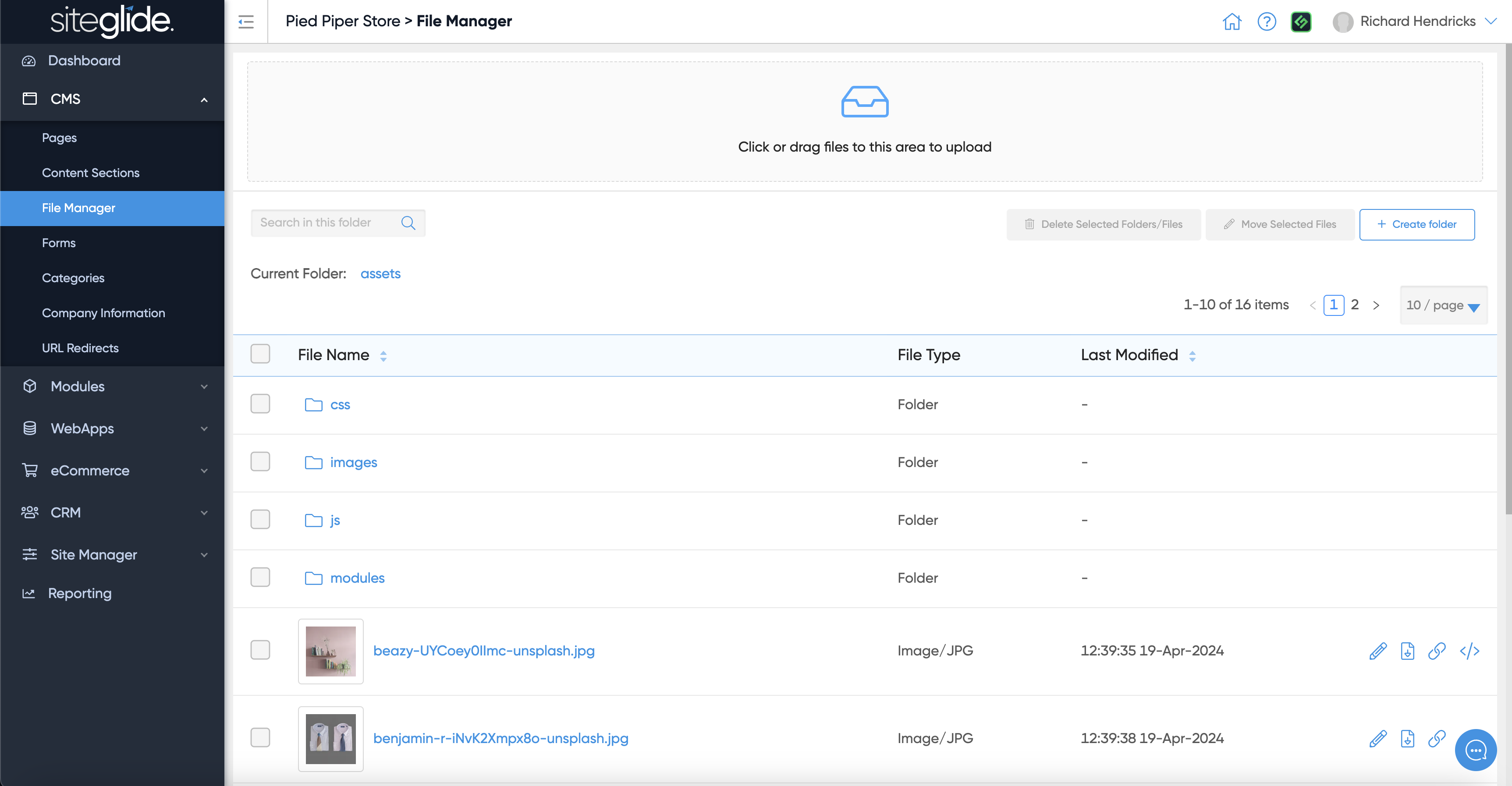 Siteglide has a built-in Document Management System (DMS) where you can create folders and upload various types of files (assets) including Images (JPG, PNG, SVG, WEBP etc), PDFs and Videos: