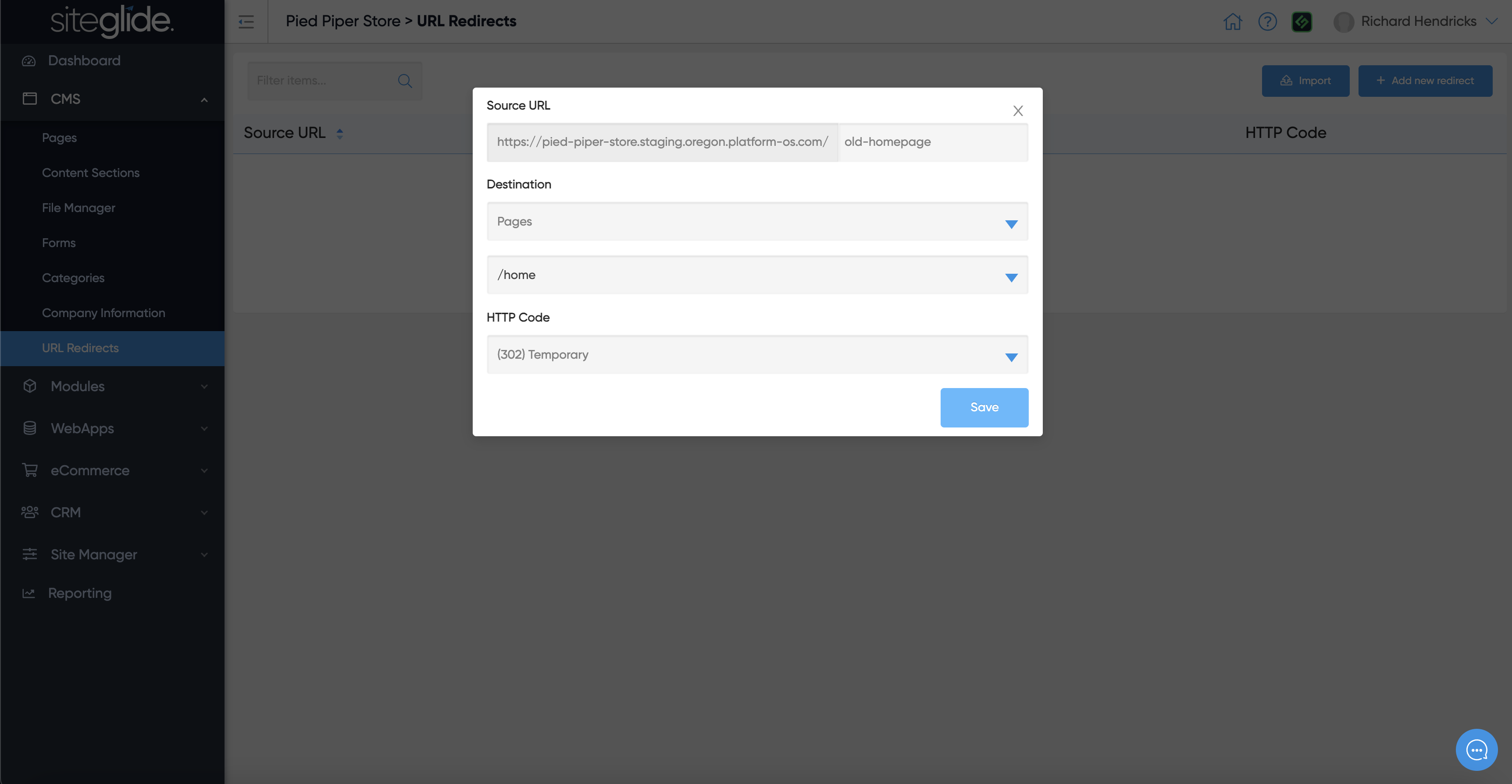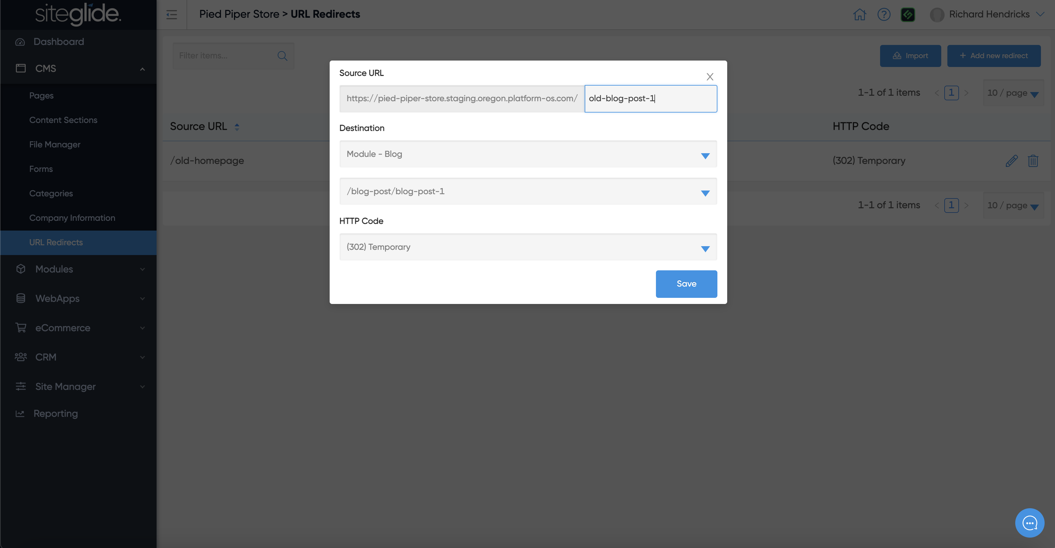 You simply type in the Source URL (Old URL) and then choose the Destination URL (New URL) and whether you would like it to be seen as temporary (302) or permanent (301) by Google. Once saved it will show in the list: