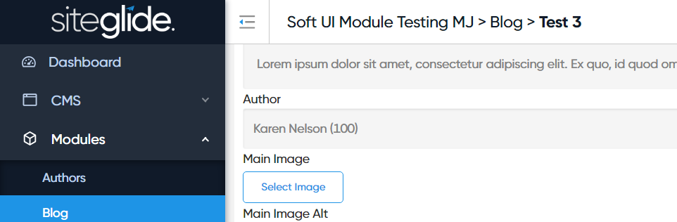 Since these two modules - the Blog and Authors Module - are both created by Siteglide, they already store the information needed to join them inside their properties. We only need to look at the existing properties in detail to get the information we need to build our query.
