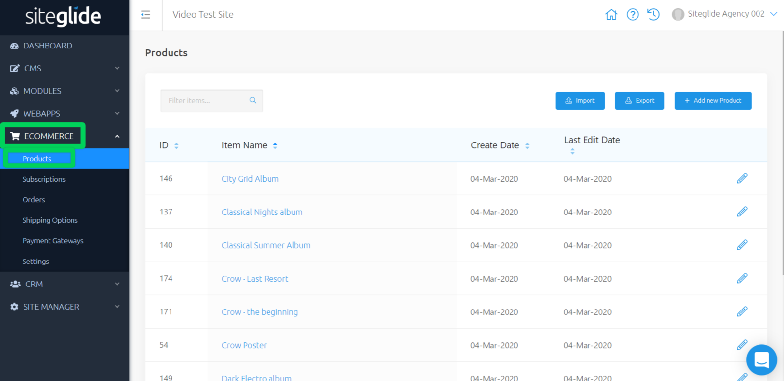 While viewing your Site Admin, use the left-hand menu to click "eCommerce" and expand the sub-menu. Next, click on "Products" to view a list of Products on your Site.