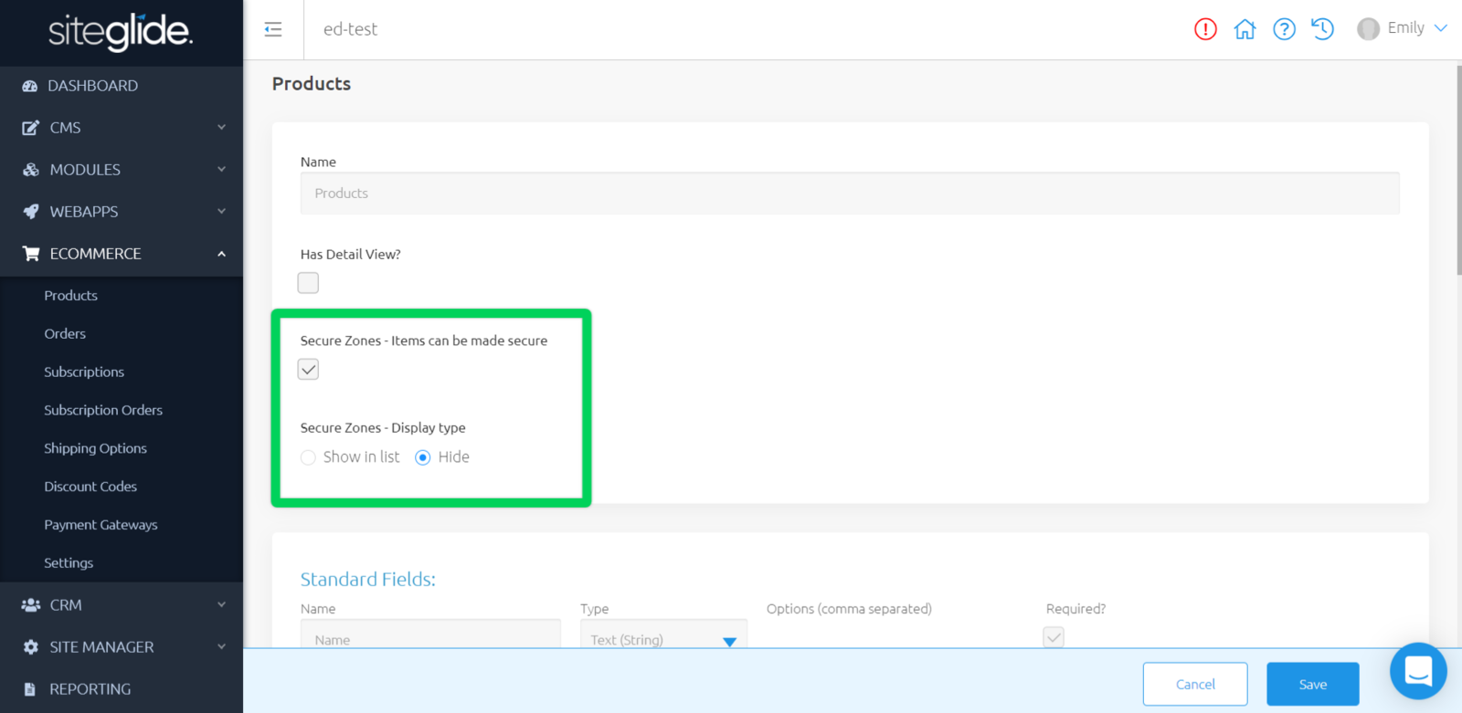 Whilst editing your Products Module Structure, you can choose to secure items within this Module.