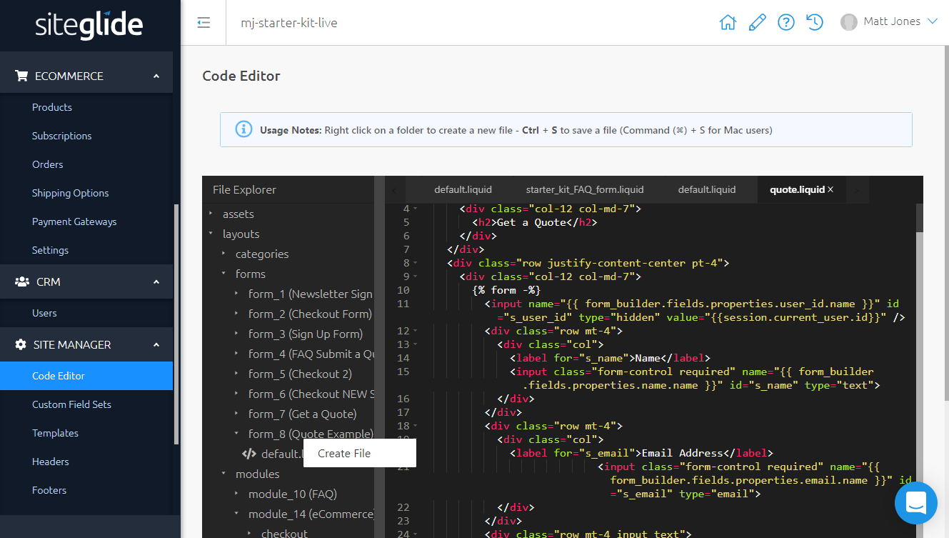 In the Examples above we started with a Starter Site and copied the code from the default Form Layout into a new Layout, editing the appearance of the Button.