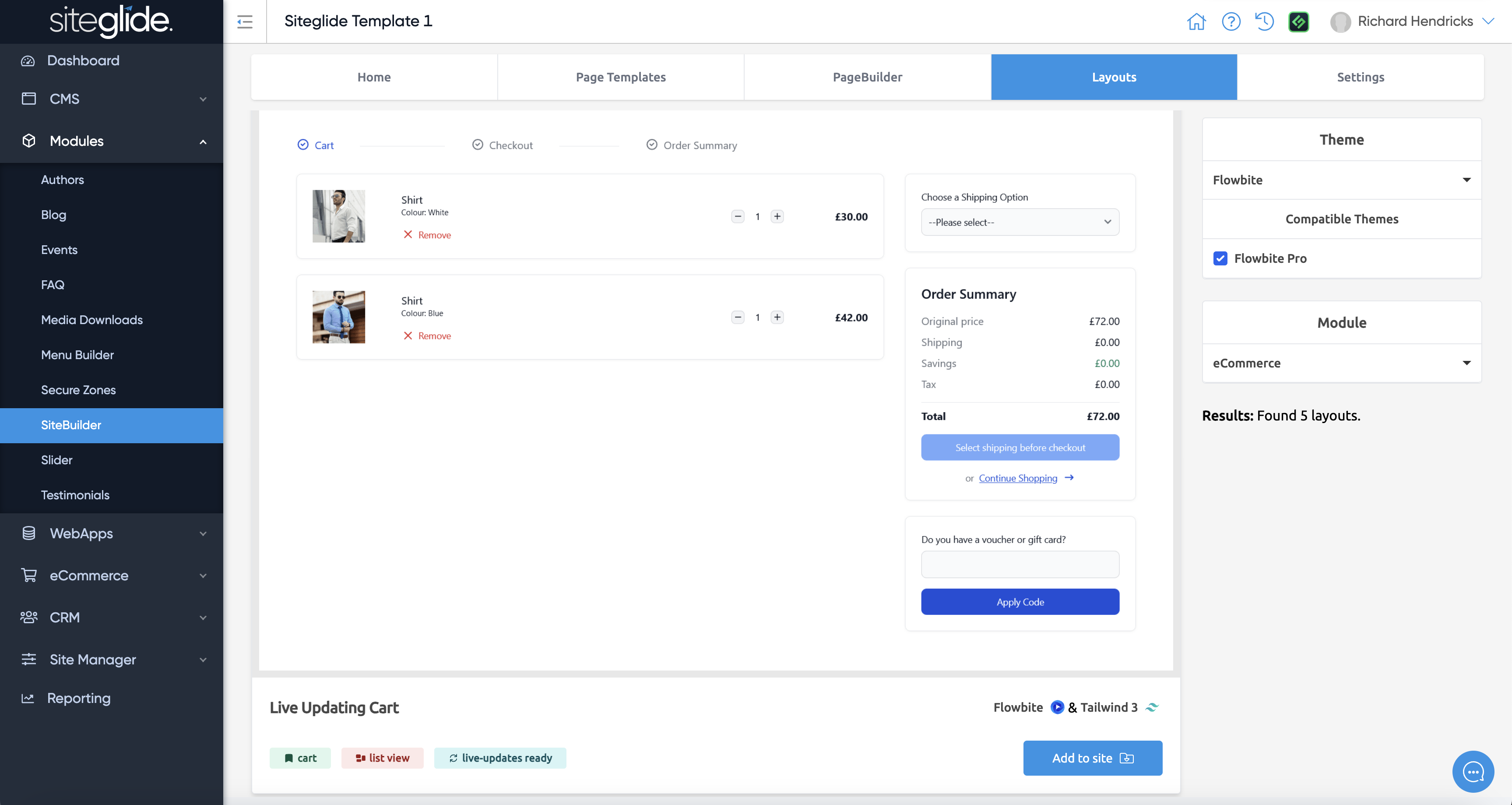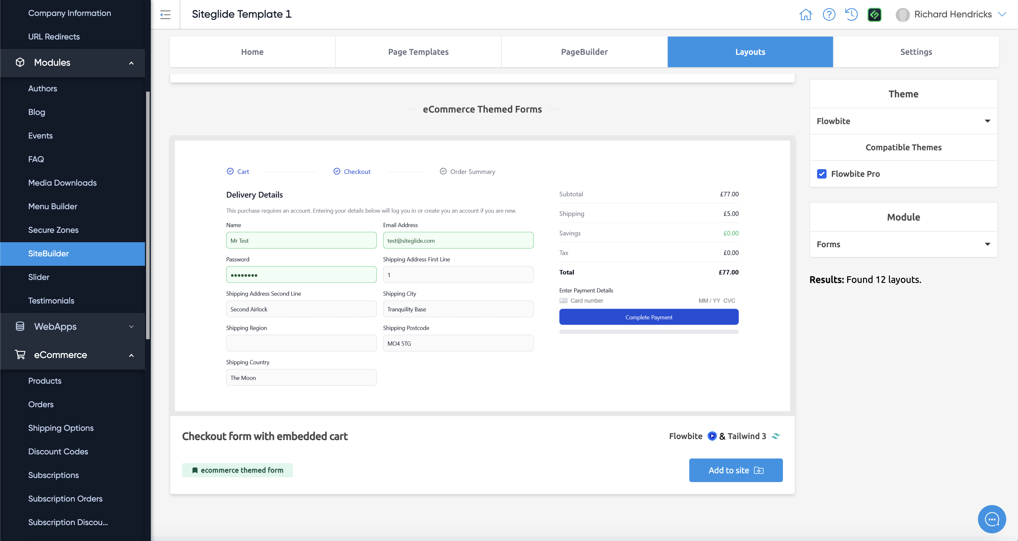 The Checkout works in a very similar way to the Cart but the Checkout Layouts in SiteBuilder can be found under Forms not eCommerce: