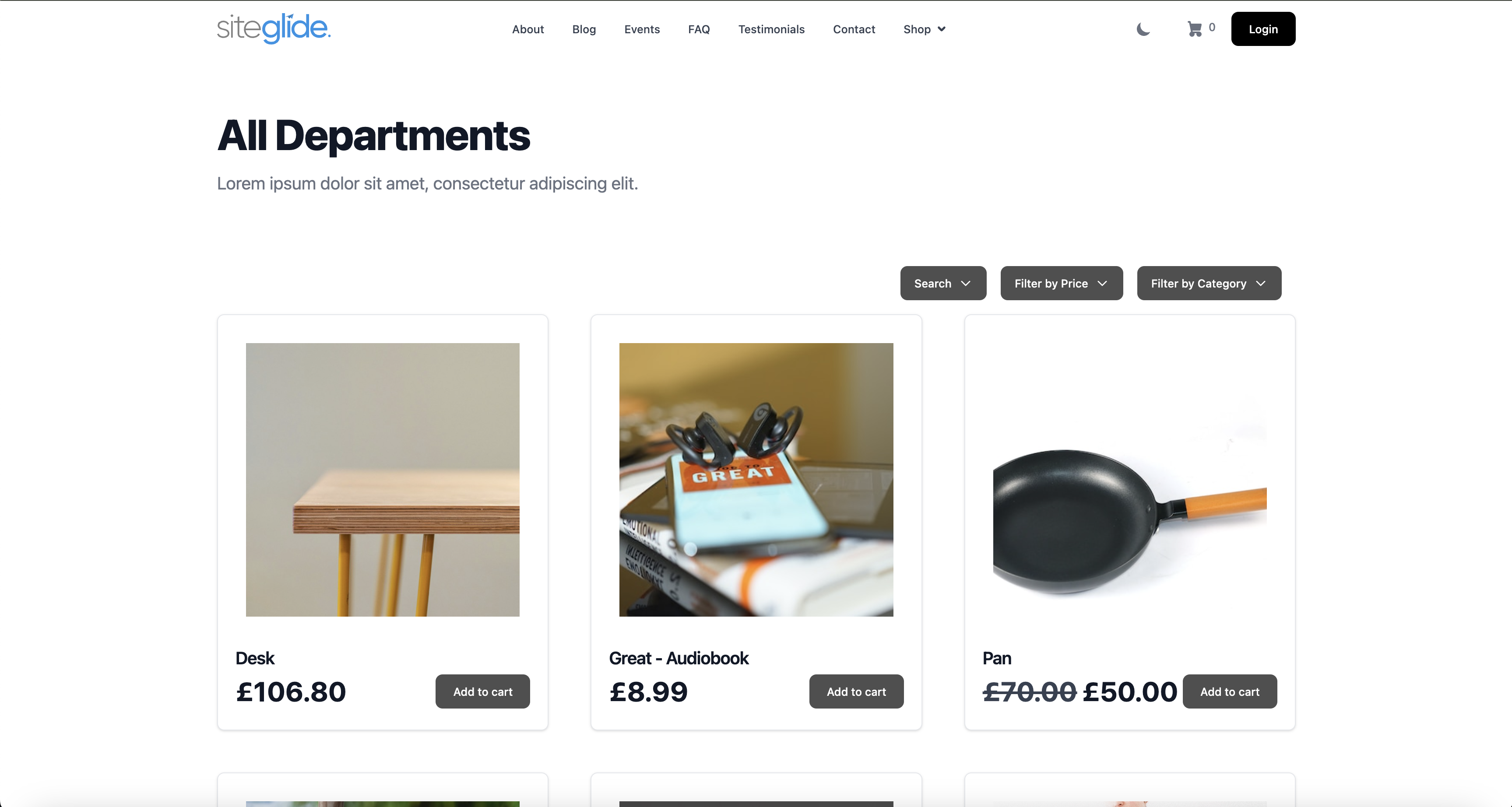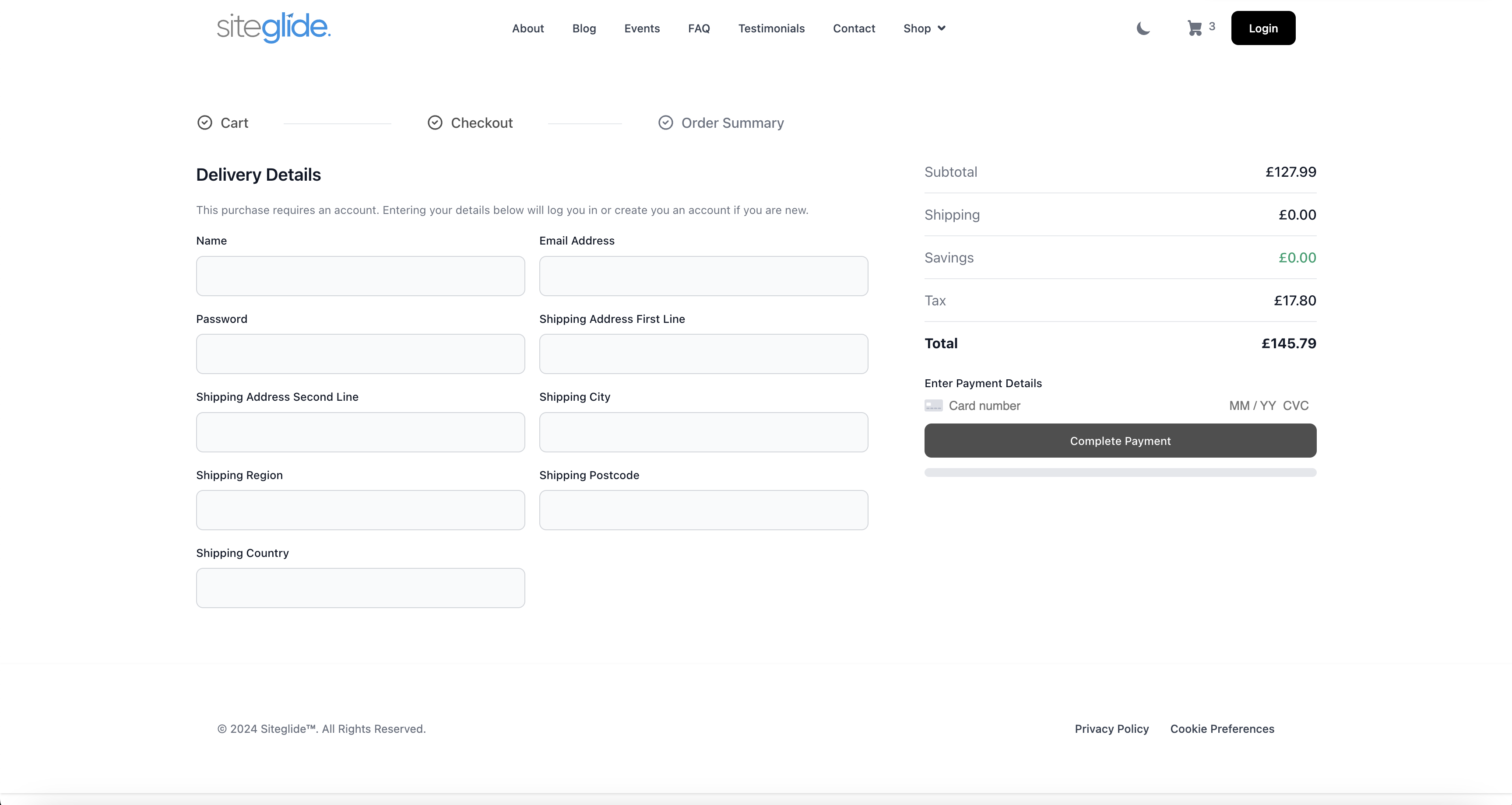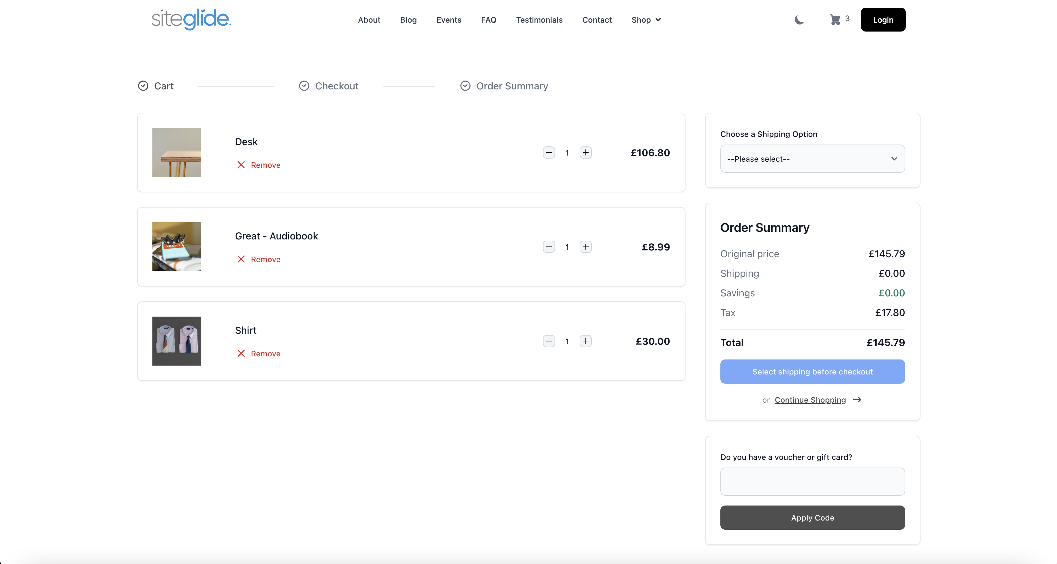 You can totally customise how your eCommerce store works in Siteglide. Here are a few features you might want to look at next: /ecommerce/get-started-ecommerce/cart-checkout-and-quotes/product-views/shipping-selection/shipping-options