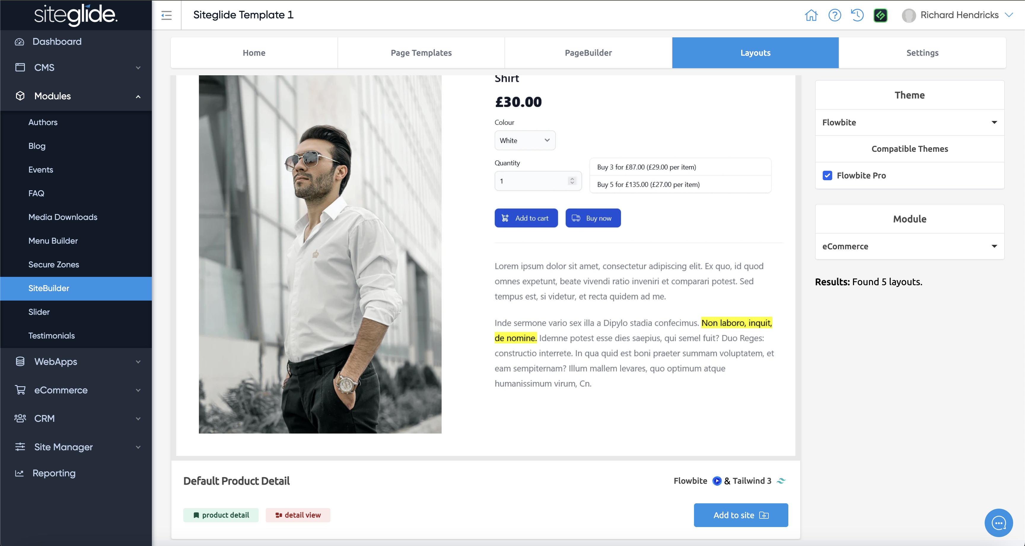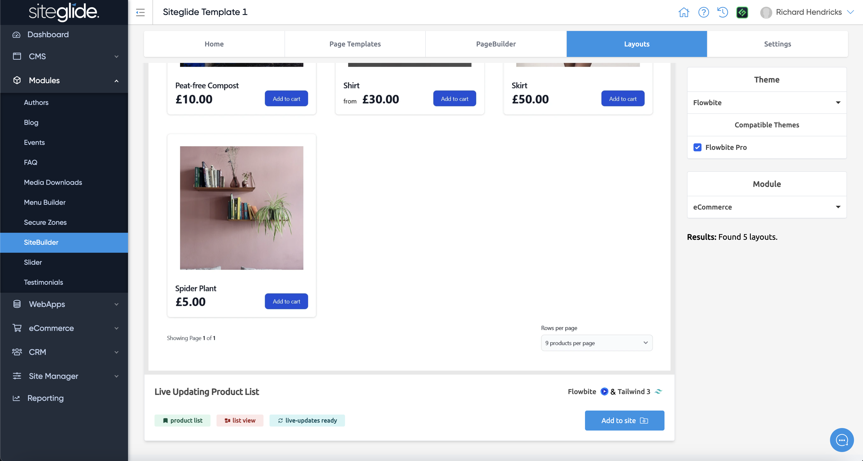 You then need to choose where to output the list of Products, in this example (the eCommerce Template) we are listing all products on the Shop page using the pl-1 layout from SiteBuilder: