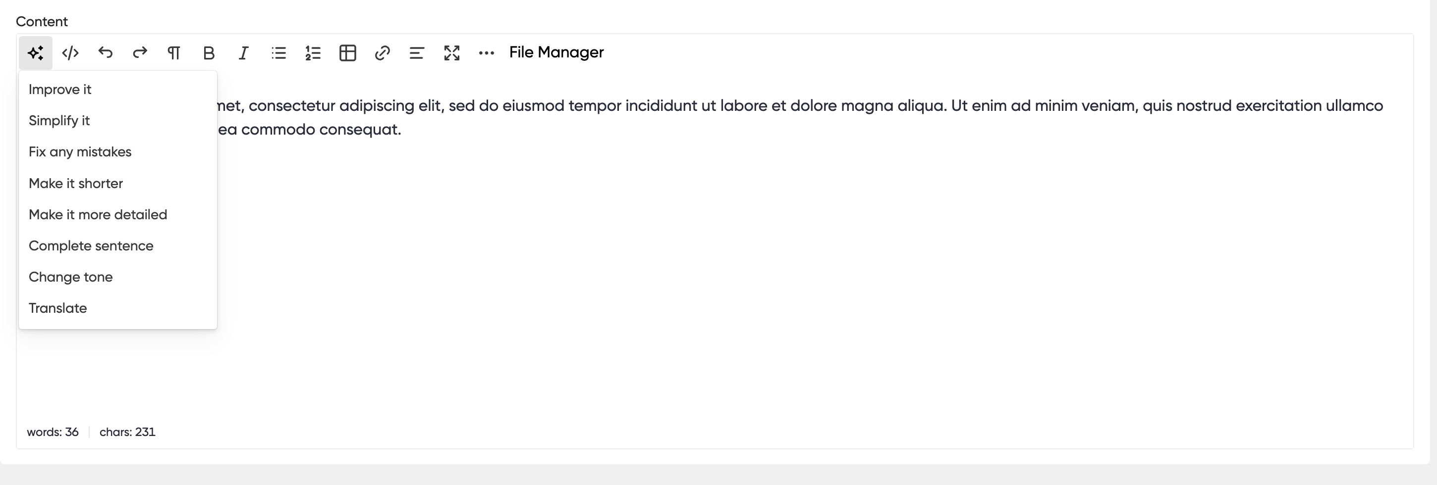 The Rich Text Editor (RTE) is used for formatting on Multi-line text fields on WebApps, Modules etc and includes AI tools to help write and improve content.