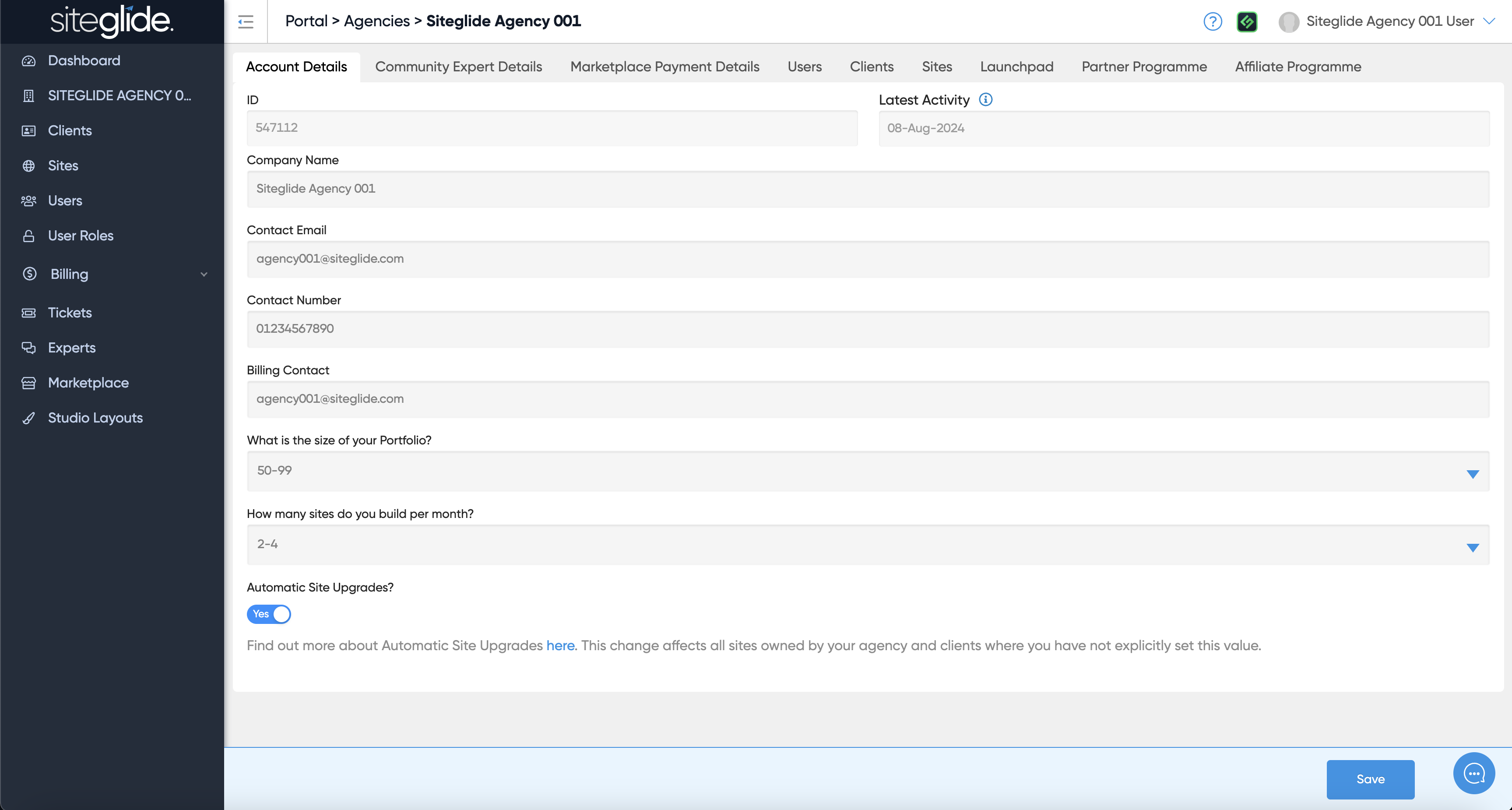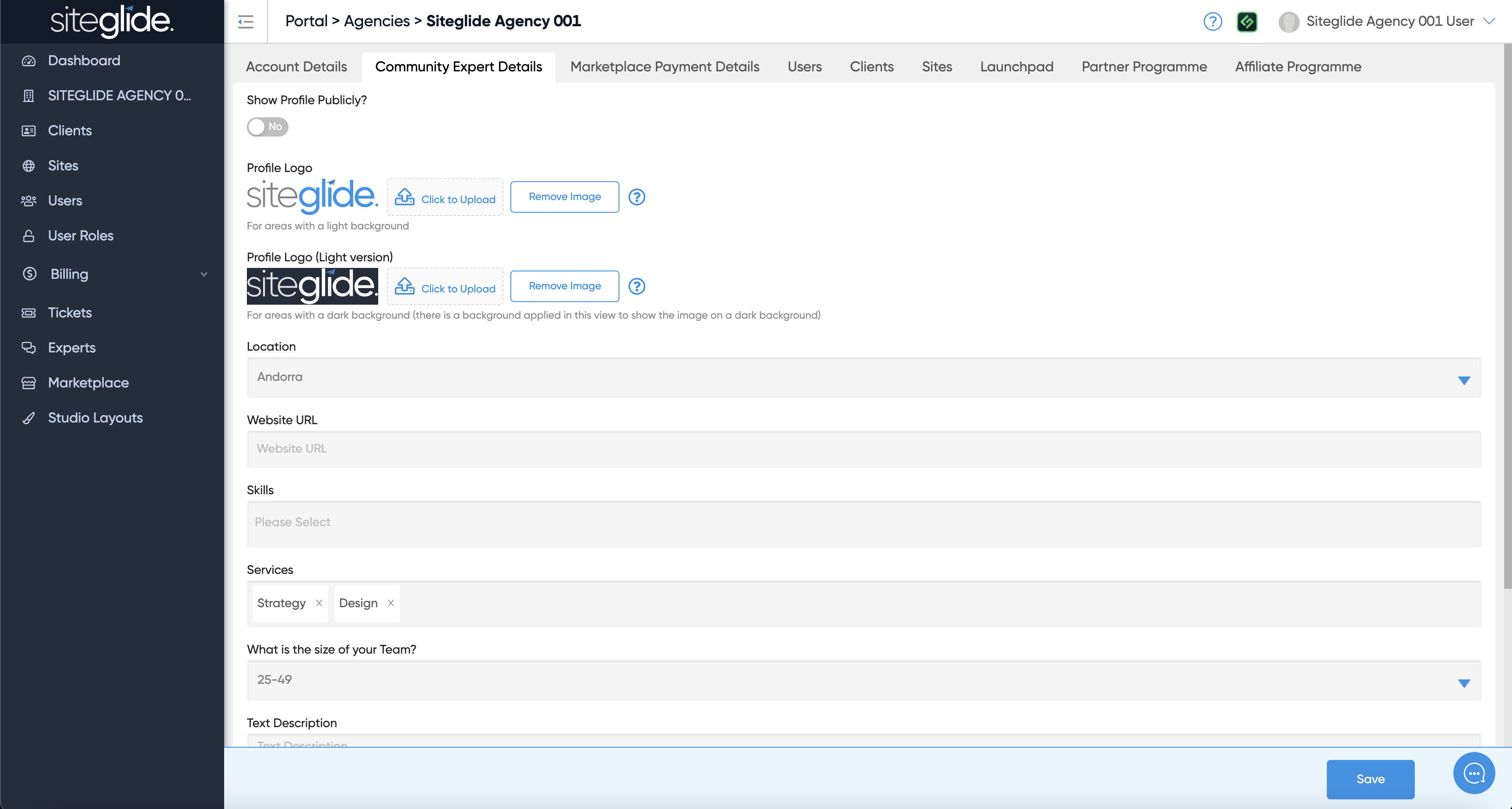 The Community Expert Details tab is where you can brand Siteglide to your Agency and create a page on the Experts area so users in need of your services can find you: