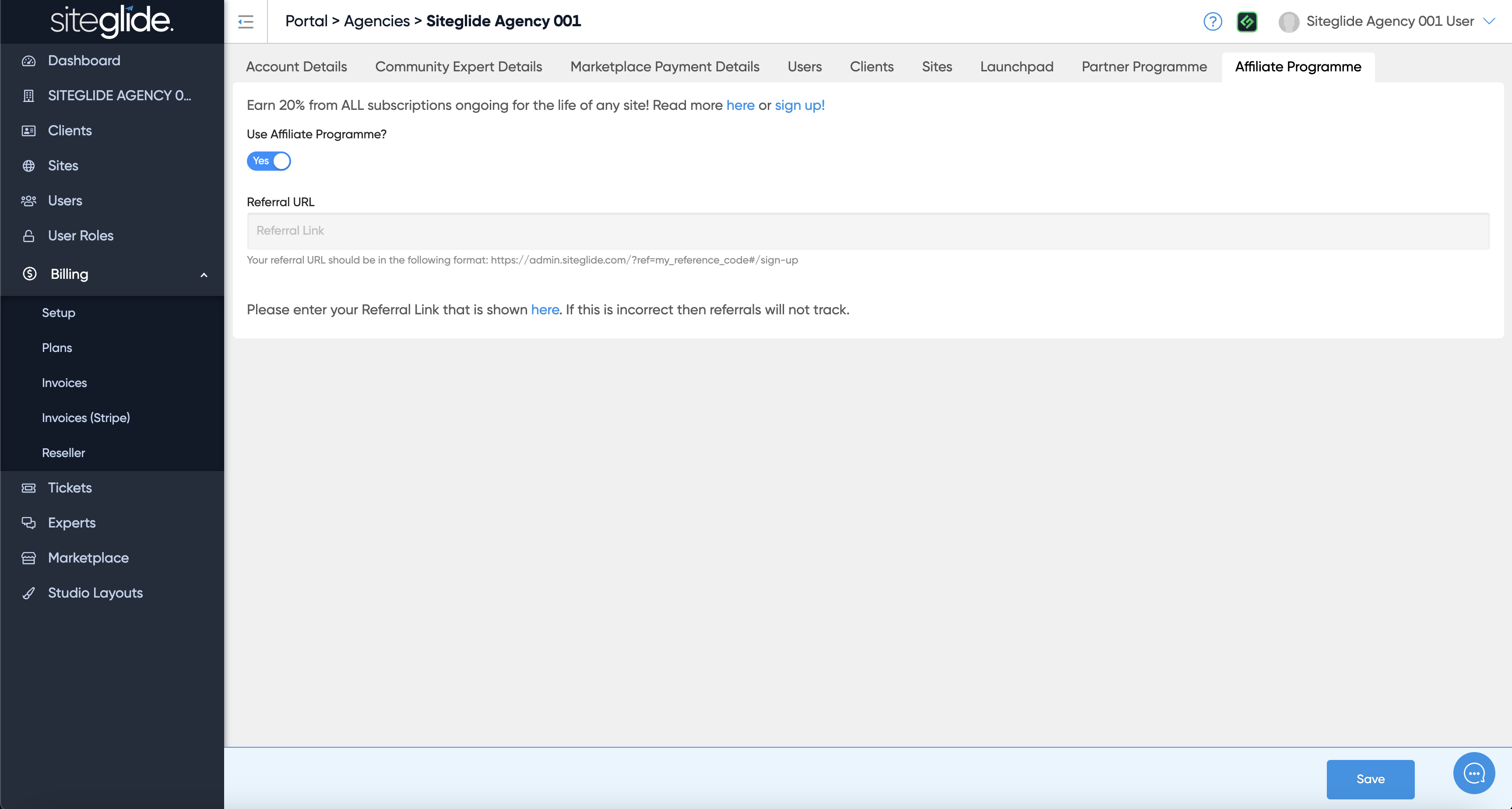 The Affiliate Programme tab lets you setup and control the affiliate commission for referring new users to Siteglide: