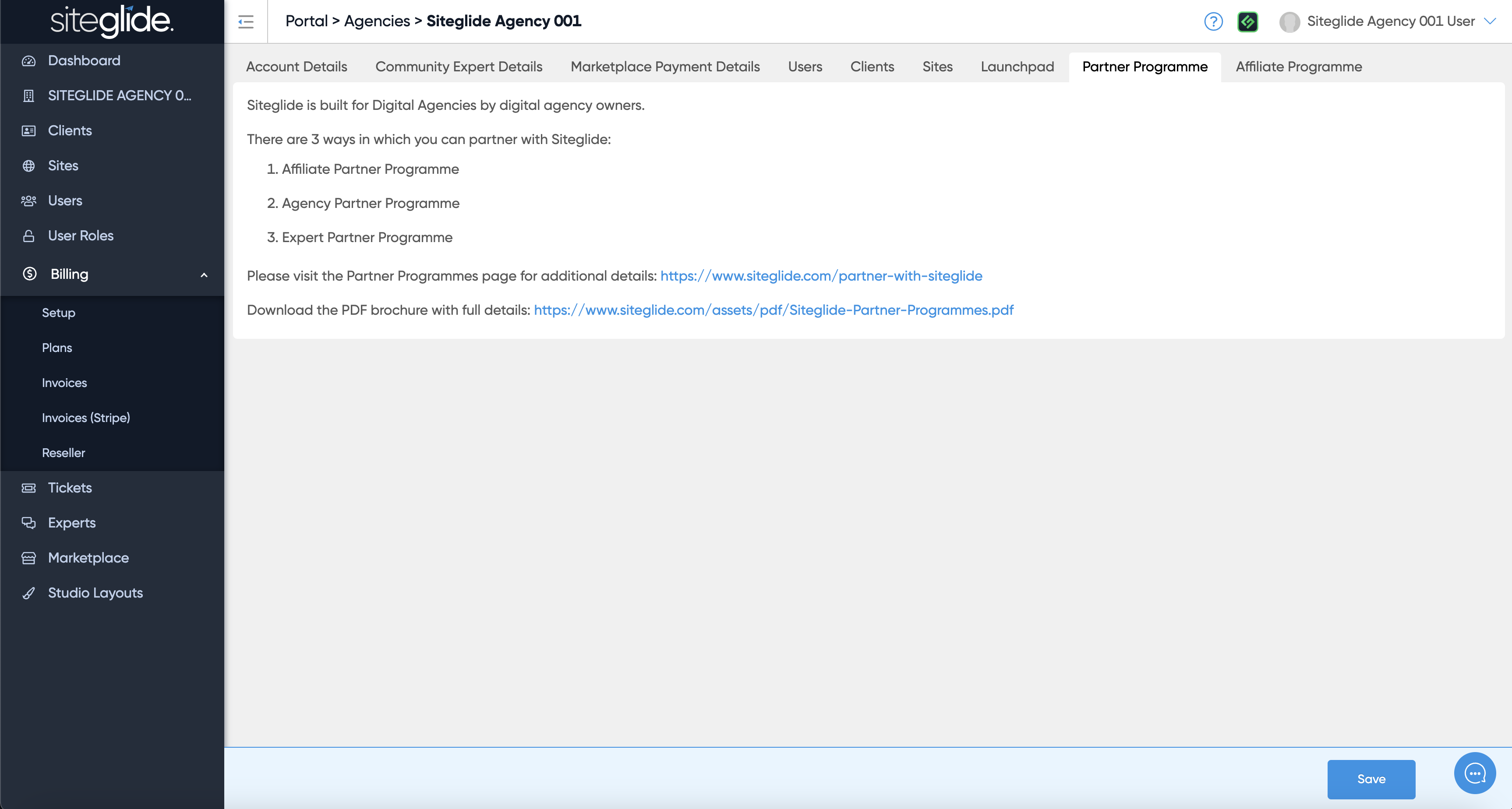 If you are an approved Siteglide Agency you will have additional features accessible from the tabs across the top: