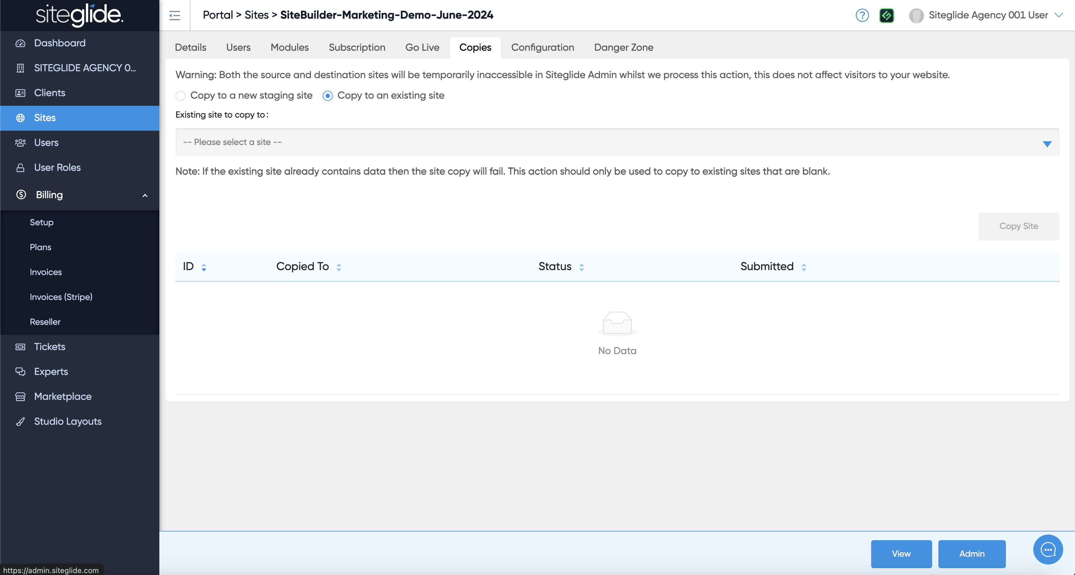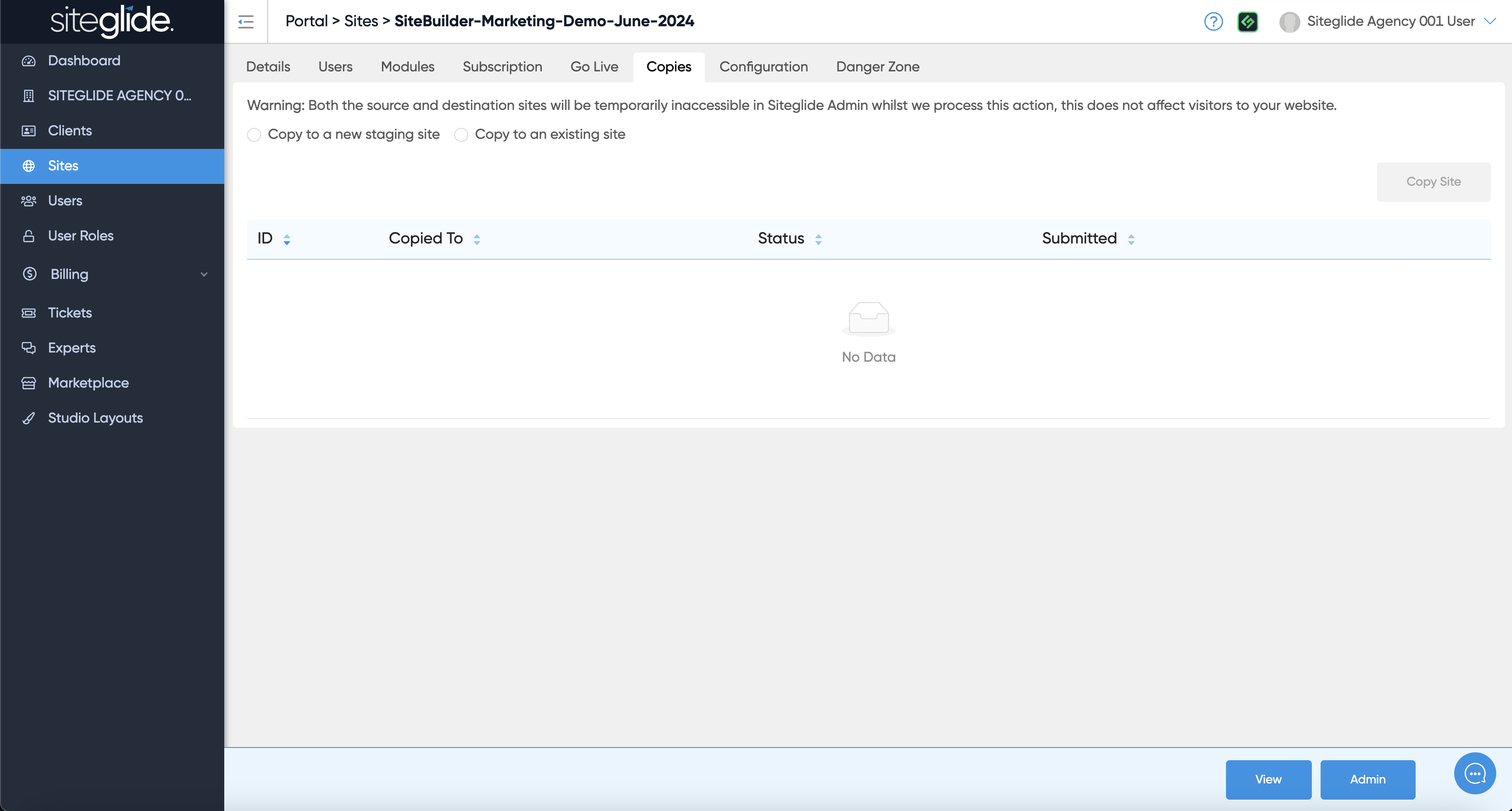 An Agency only feature is being able to make copies of existing sites either to a blank Staging or to an existing Site (can be a Production Site):