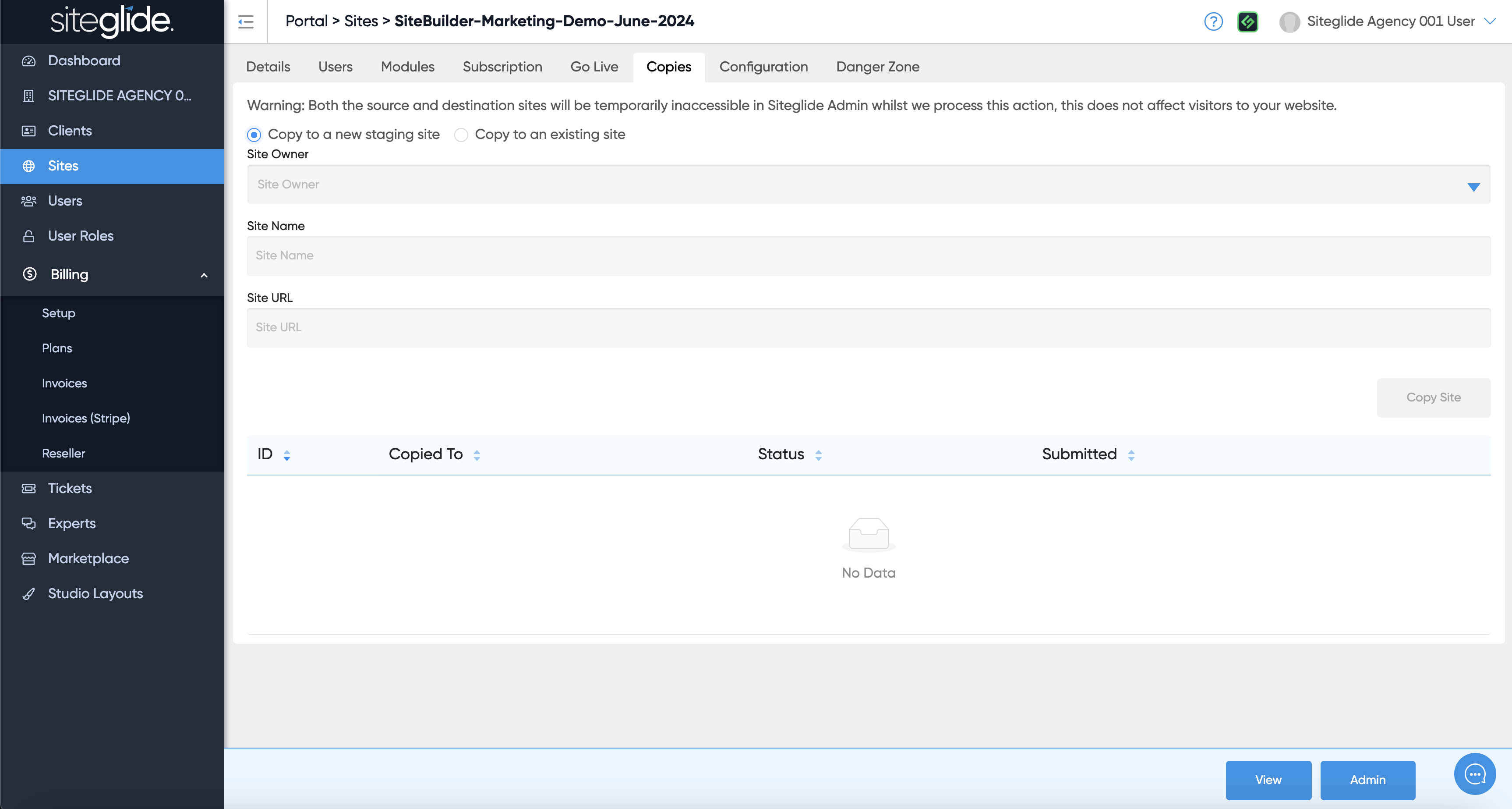 To copy to a new Staging Site click the first radio button and then choose the Site Owner (your Agency or a Client folder) and give the Site a Name/URL: