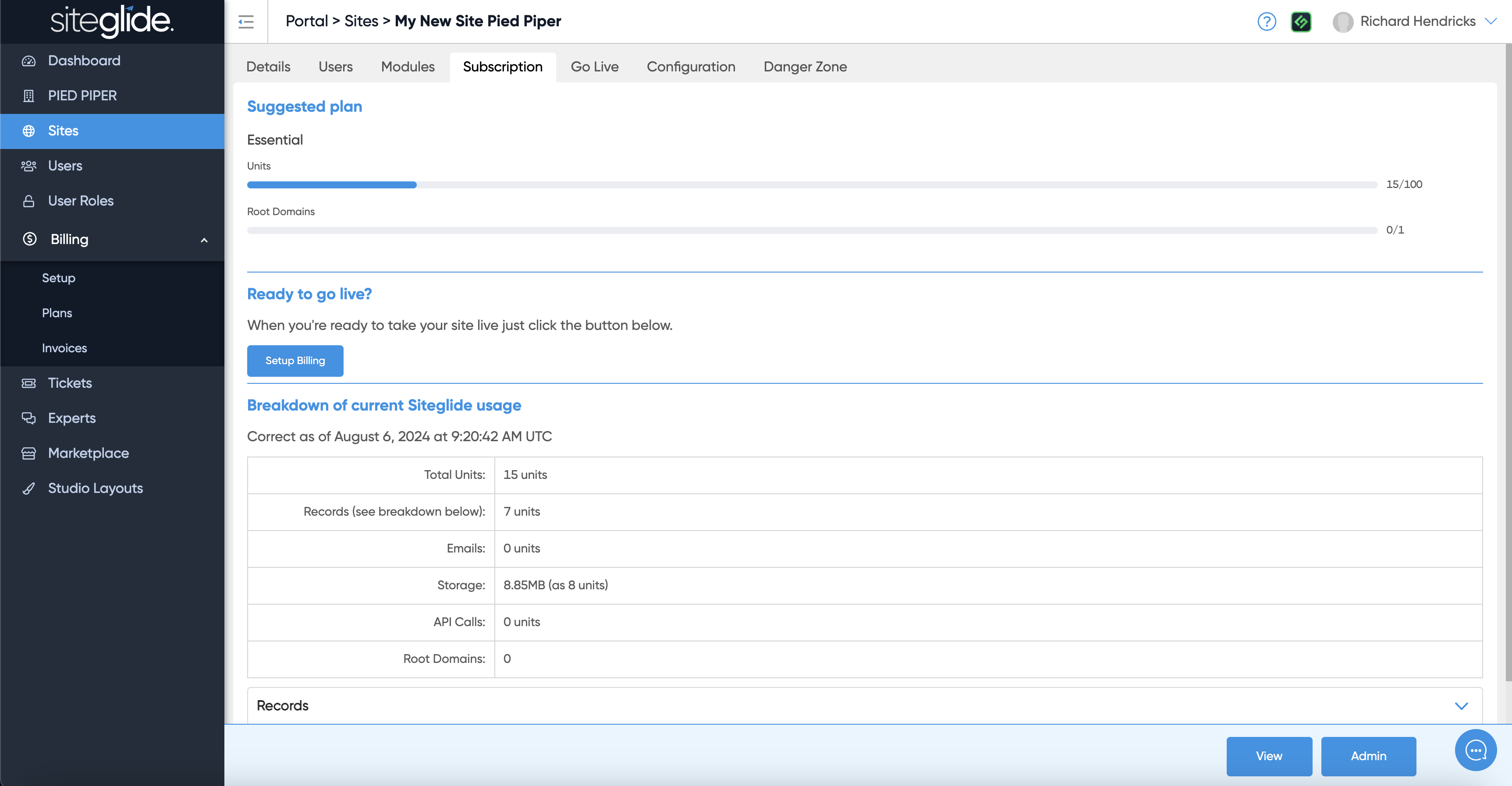 The Subscription tab will show your Site Usage and what plan you're on or which plan we recommend if the site is not yet Live: