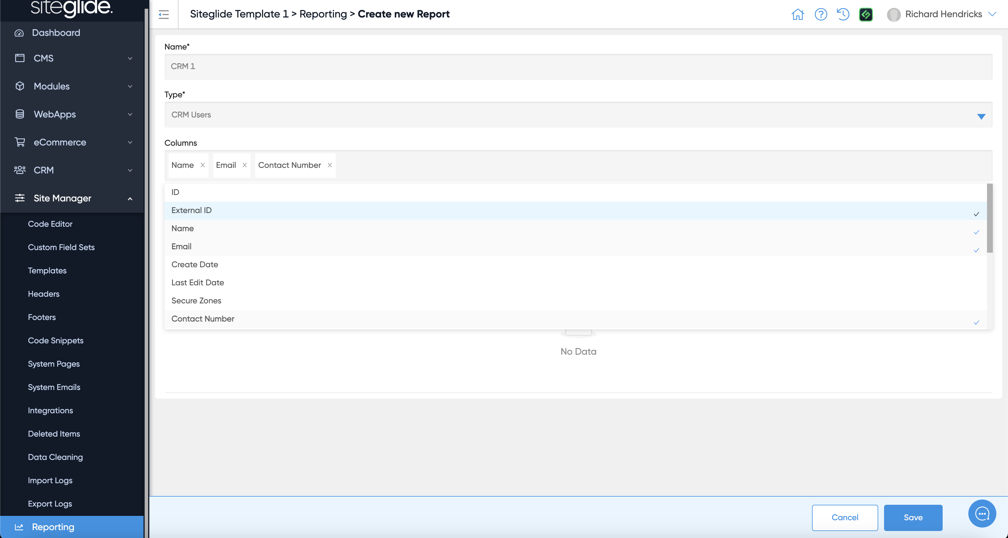 When creating a new Report simply give it a name, decide if you're querying the CRM Users Database or the Cases Database and then pick the Fields you want to include:
