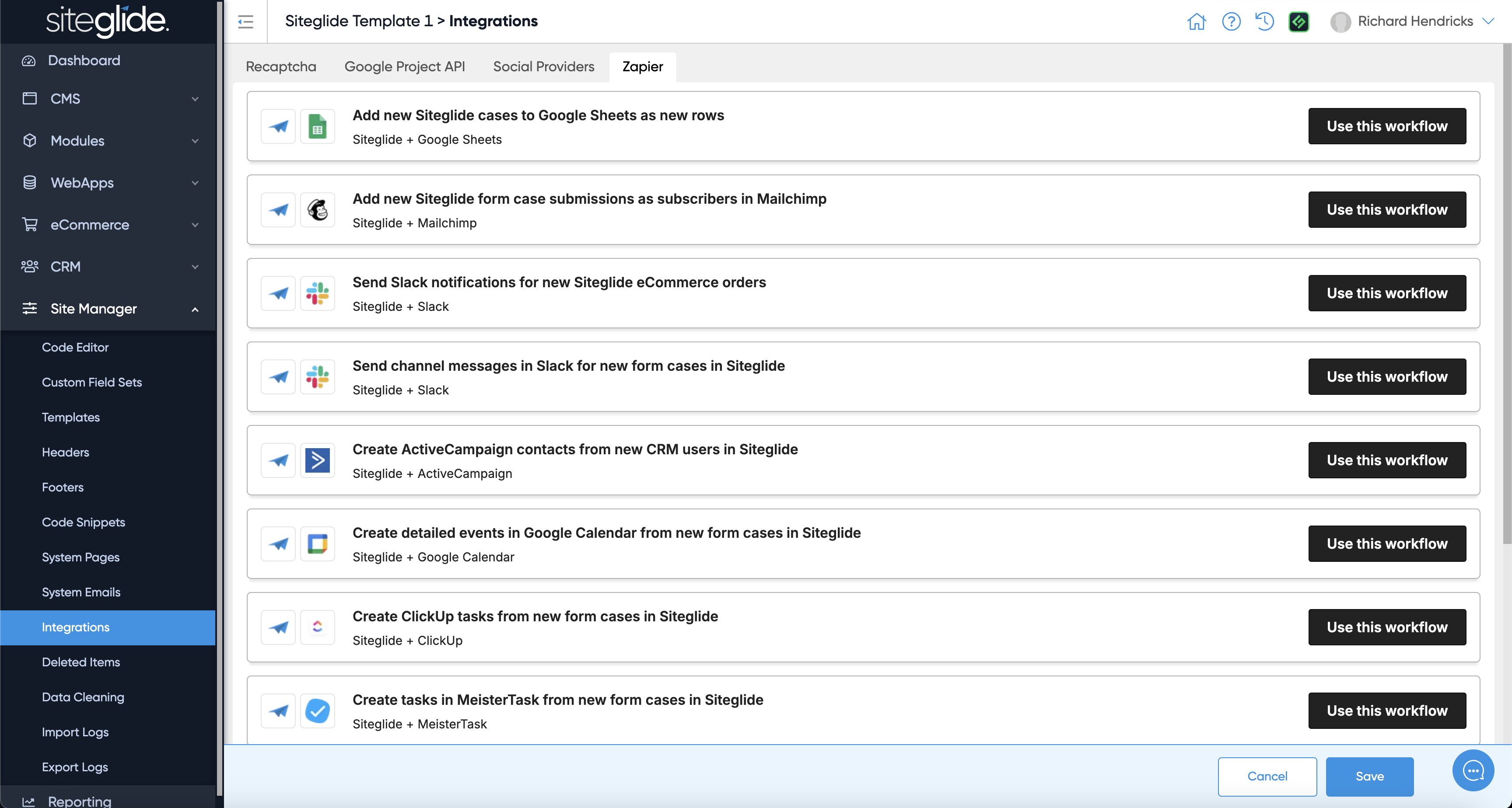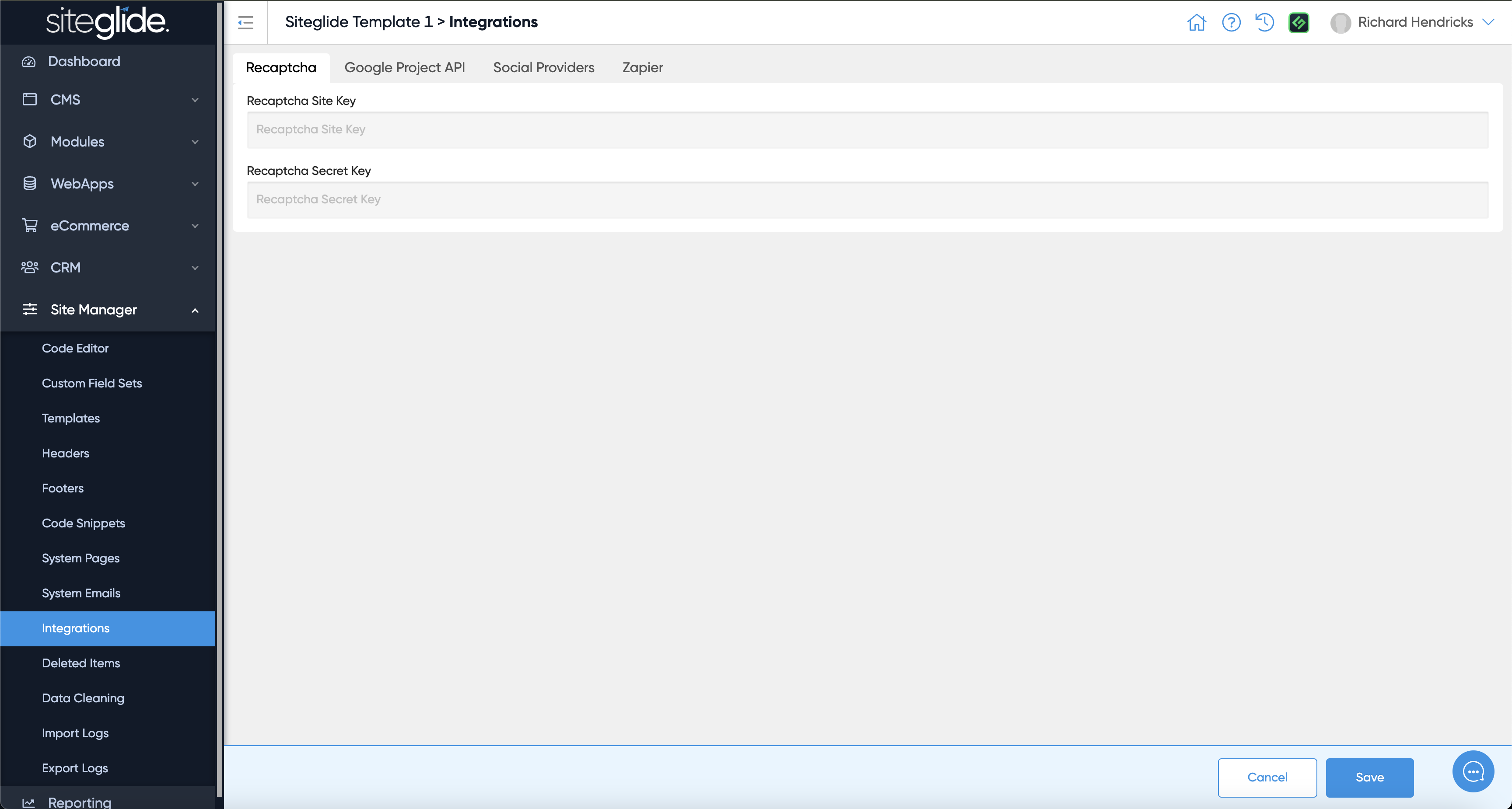 The Integrations area lets you manage various tools such as Recaptcha, Google APIs, Social Media Providers and Zapier.