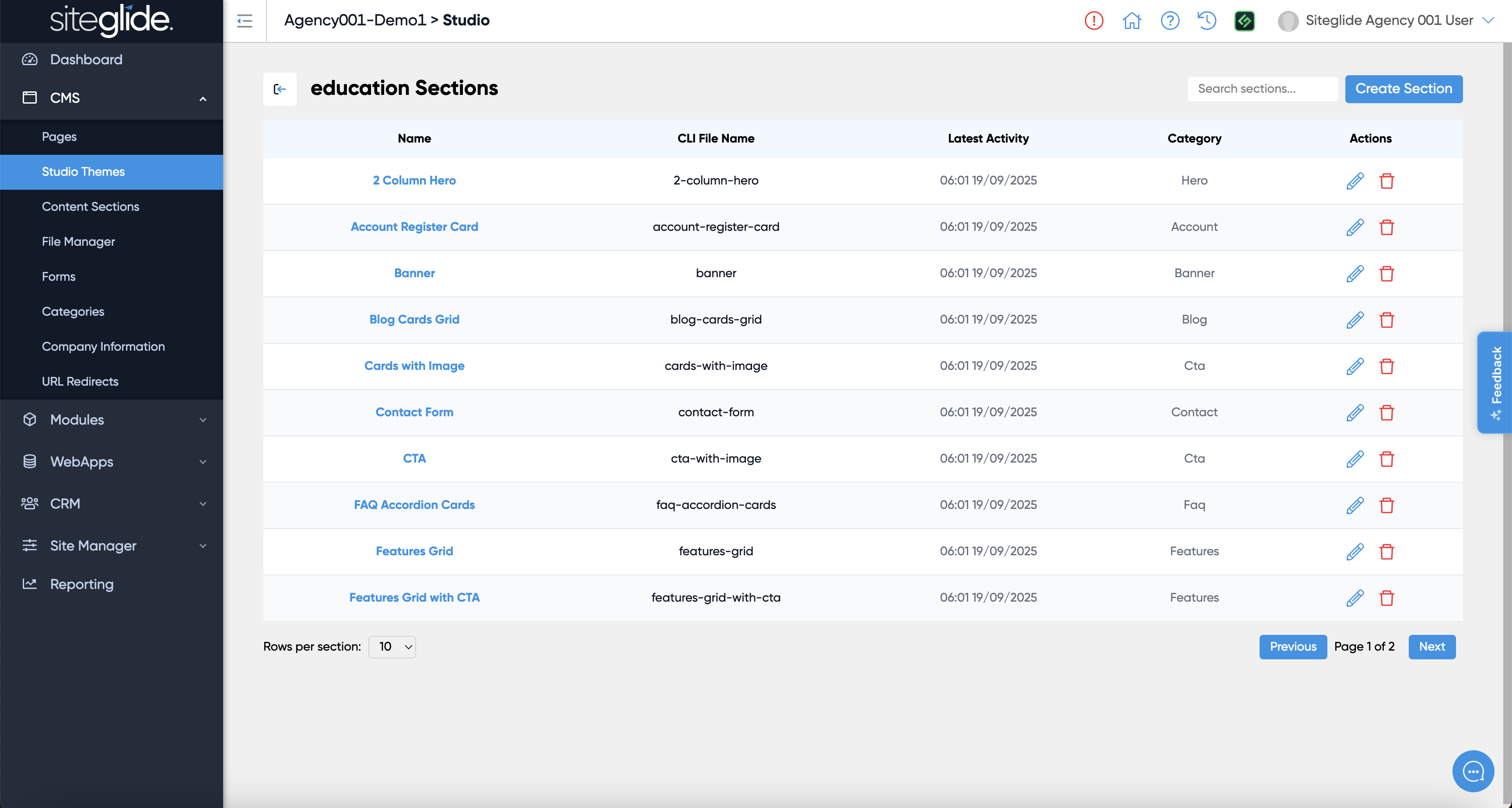 Sections are a fundamental element of how Studio works with the modular, 'brick by brick' approach. Developers write whatever code is required inside the section and then use the Studio tags to make the content editable in the Studio UI.